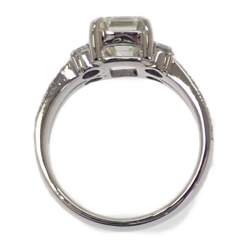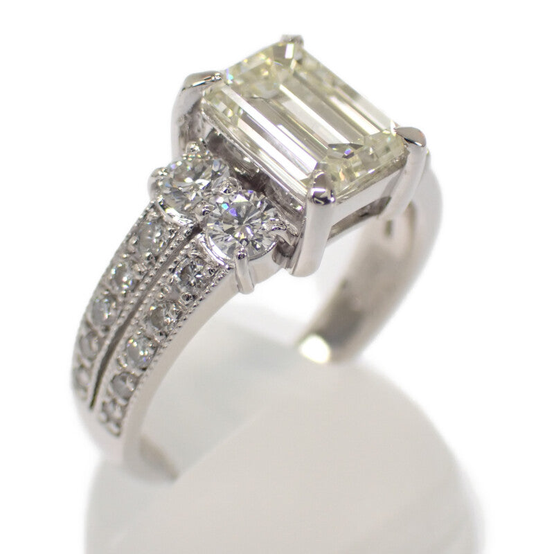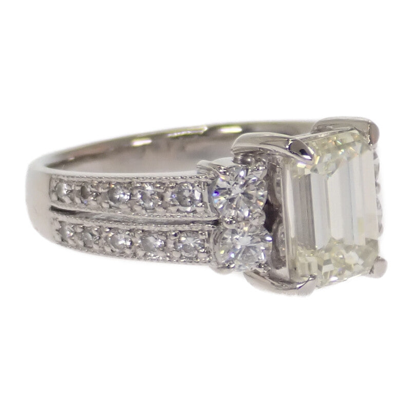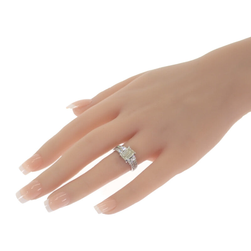 中央に輝く2カラット以上のスクエアカットダイヤモンドが、ゴージャスな存在感を放つデザインリングです。