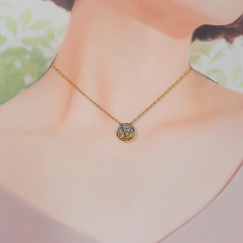 ルイヴィトンの象徴「LVイニシャル」がセンターにあしらわれた、ツートンカラーのネックレス。上品なゴールド×シルバーのコンビネーションが、モードでエッジの効いた印象を演出します。重厚感のあるチェーンデザインと、エレガントなロゴモチーフのバランスが絶妙。メタル素材ならではの光沢と、ミニマルながら力強いディテールが、胸元にアイコニックな存在感を添えます。