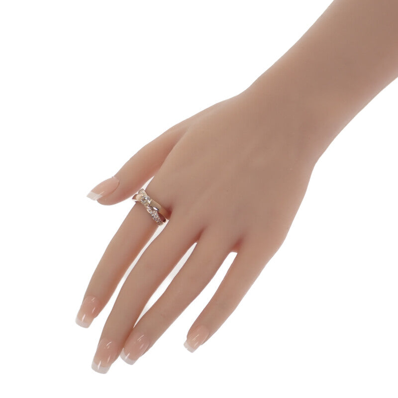 指元で優雅に交差するアームのラインが柔らかな印象を与え、ダイヤのきらめきが華やかさを添えます。