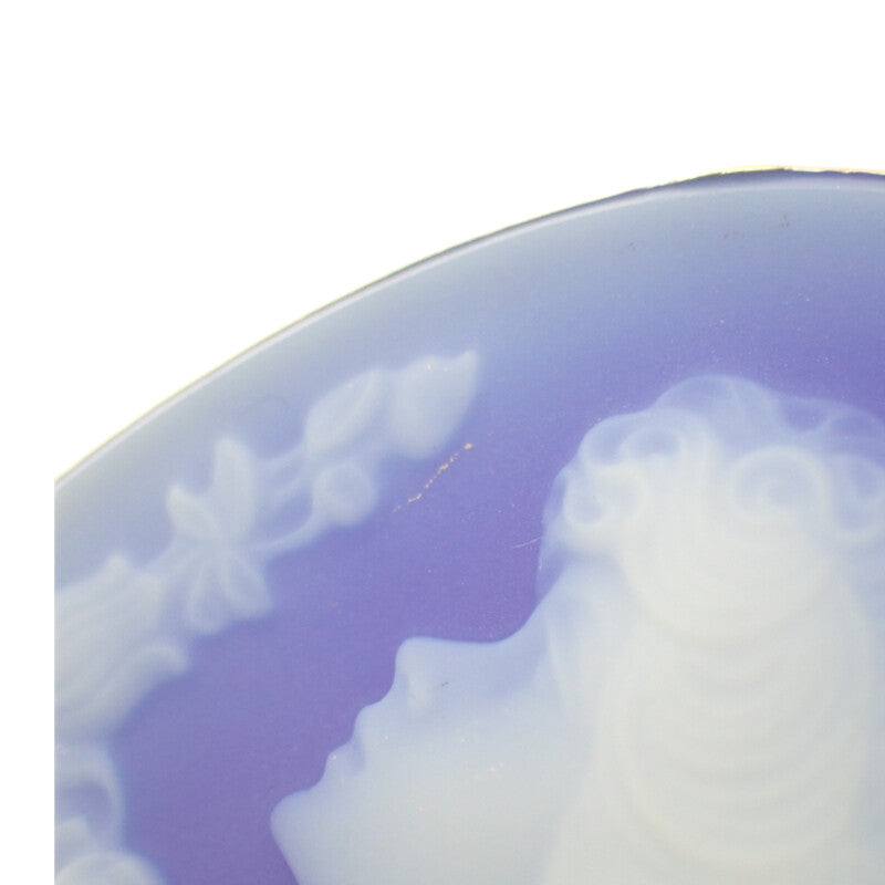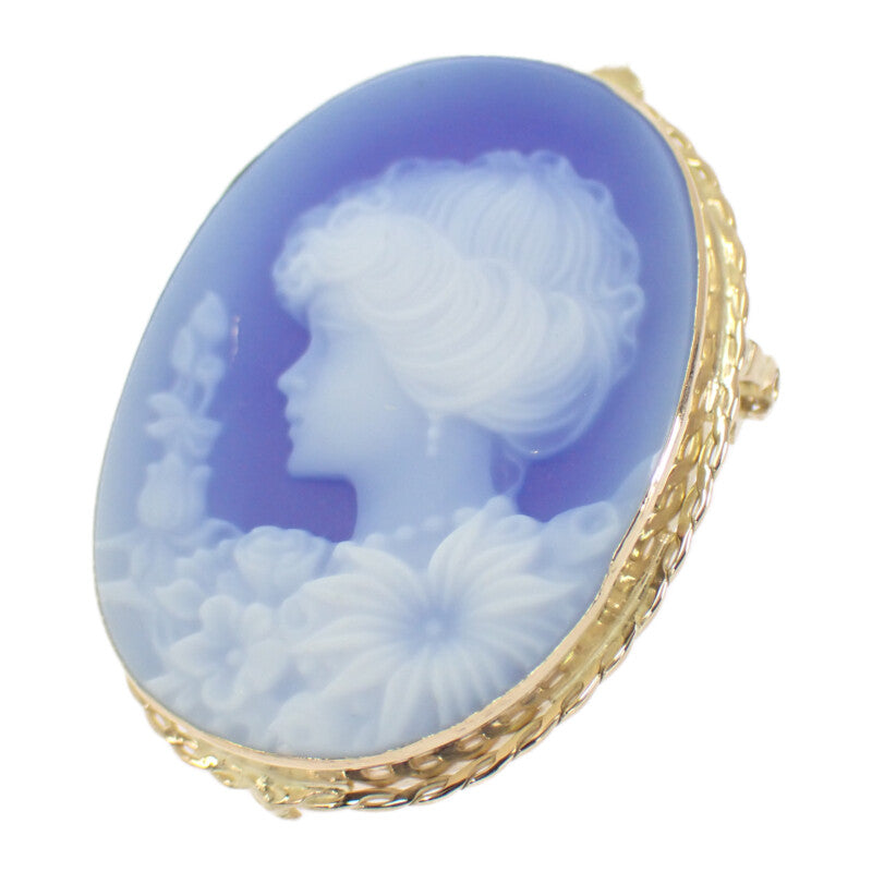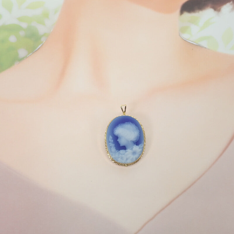 透明感のあるメノウのブルーと、細部まで繊細に表現された女性モチーフがフェミニンなカメオジュエリーです。