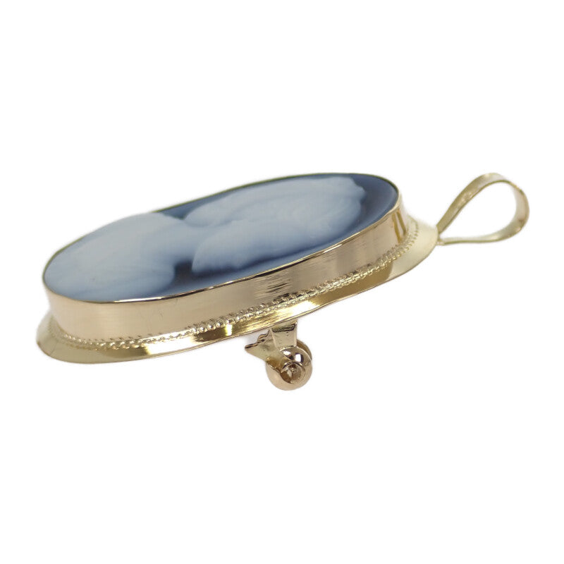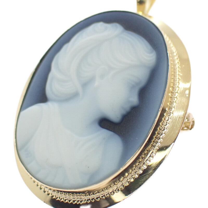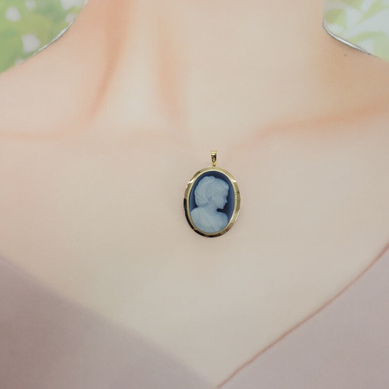 深いネイビーブルーをベースに、上品さを感じさせる繊細な女性モチーフがデザインされたカメオジュエリーです。