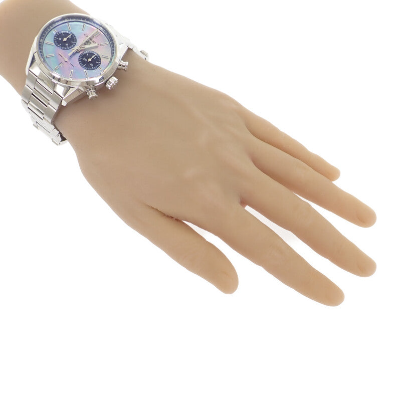 ライトブルーシェルの文字盤が華やかで幻想的な雰囲気を演出し、他にはない個性が感じられます。