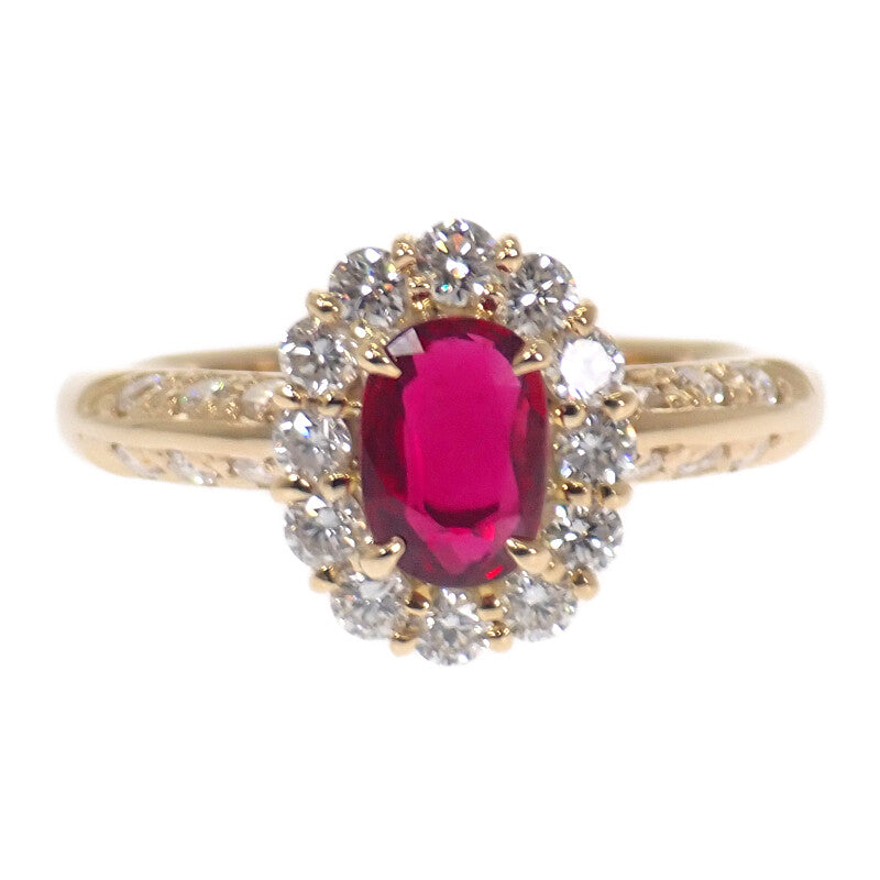 中央の加熱処理されたルビーは深みのある赤が美しく、周囲を囲むダイヤモンドが華やかさと気品を引き立てます。クラシカルなデザインながらも、指元に洗練された存在感を添える逸品。特別な日を彩るにふさわしい、エレガンスを宿したジュエリーです。