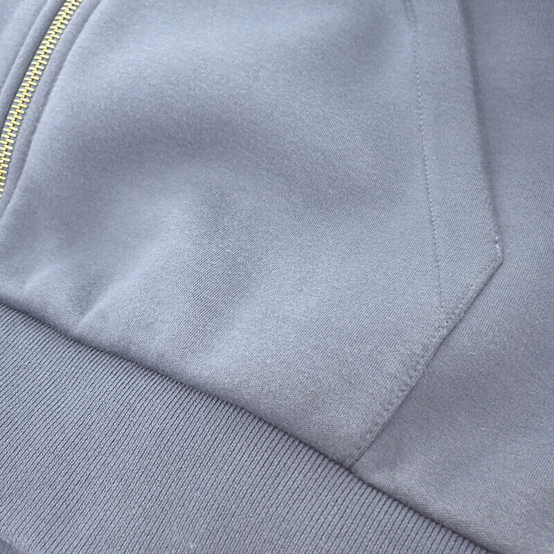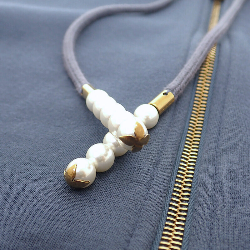 洗練されたスレートグレーの色合いに、モダンなアクセントとしてフェイクパールをあしらったジップジャージーフーディ。上質なコットン素材を使用し、軽やかな着心地とラグジュアリーな雰囲気を両立。フロントジップとフーディ仕様で実用性も高く、スポーティーさとエレガンスを兼ね備えた一着です。