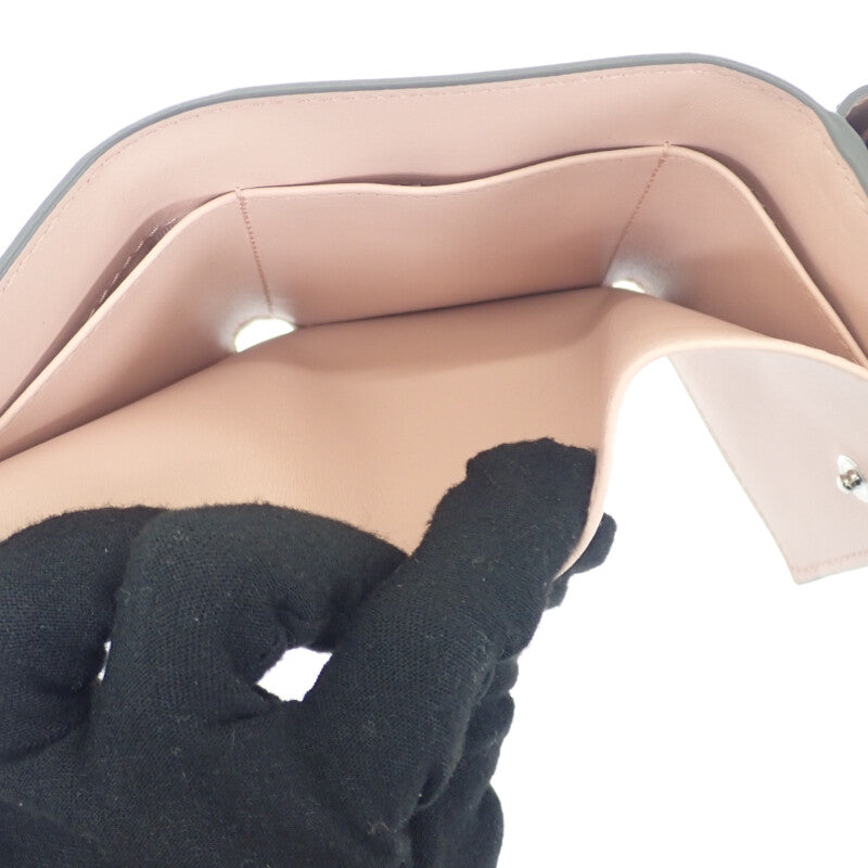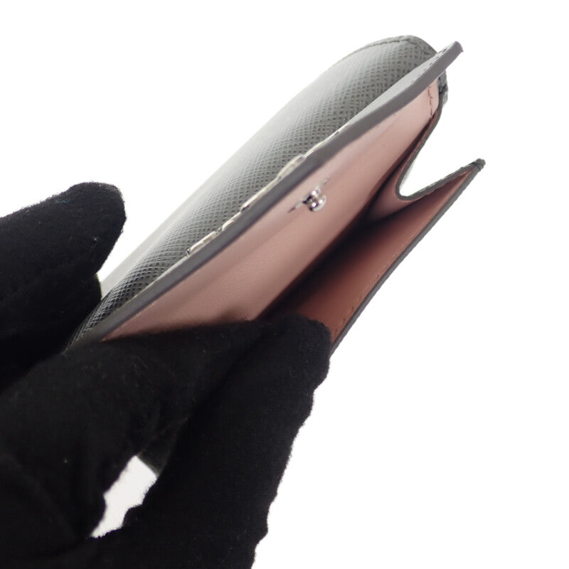 プラダのアイコン素材「サフィアーノレザー」を使用した、上品なグレーのコンパクトウォレット。高級感あふれるしなやかな手触りと、傷や汚れに強い耐久性が特徴です。