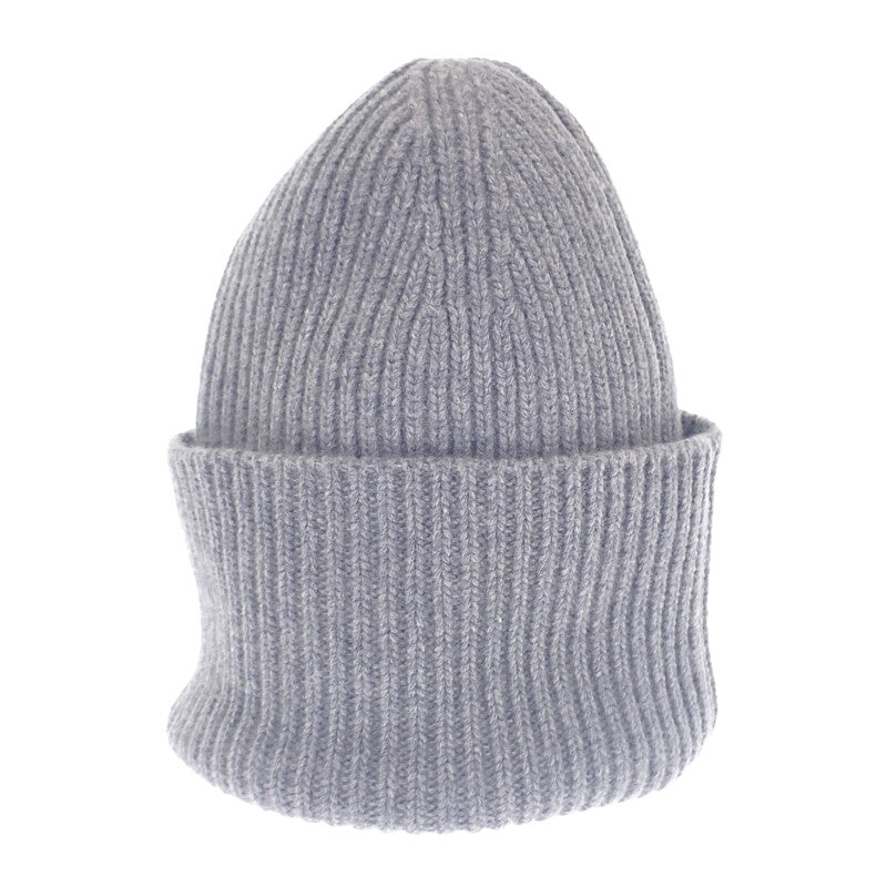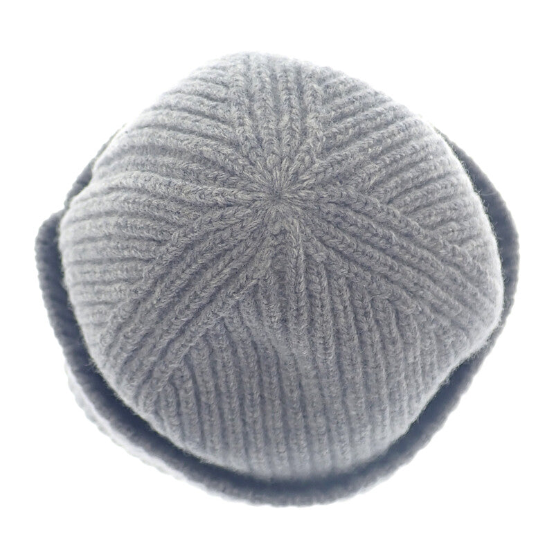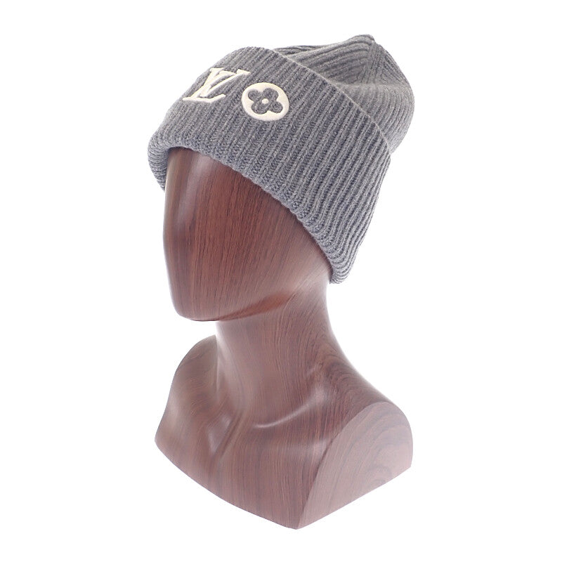 グレーのウールをリブ編みで仕立てた定番のニットキャップにLVシグネチャー、モノグラムフラワーモチーフが立体的に刺繍されたアイテム。