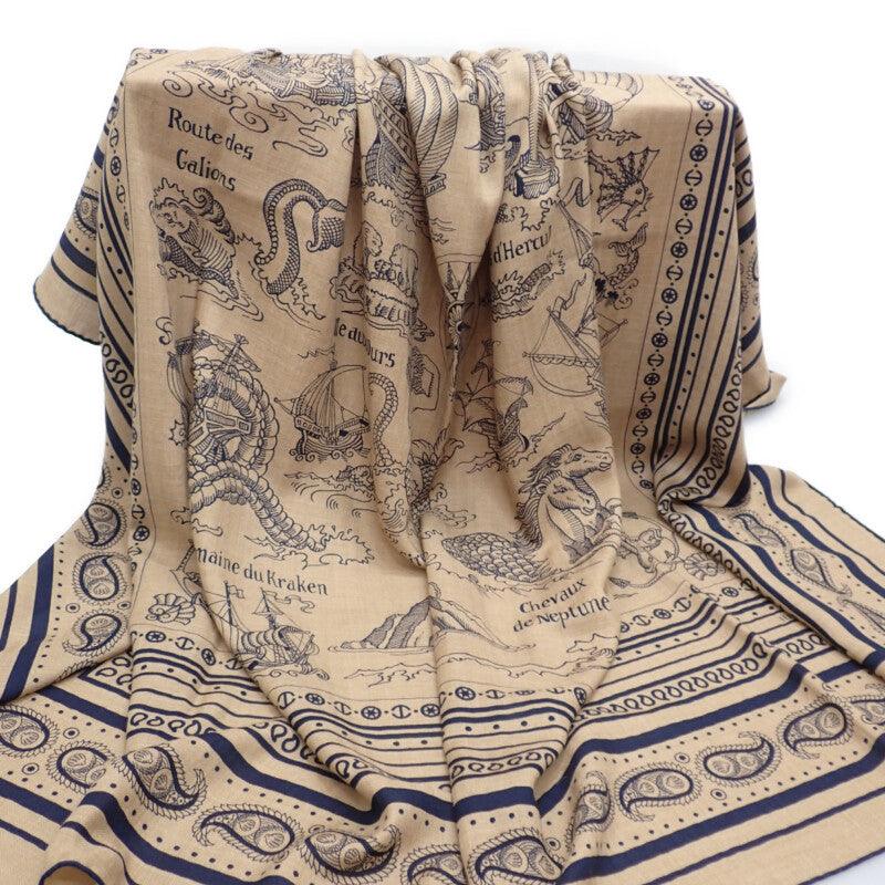 「船乗りのタトゥー」をモチーフとし、躍動感あふれるデザインがナチュラルな配色に映える大判スカーフです。